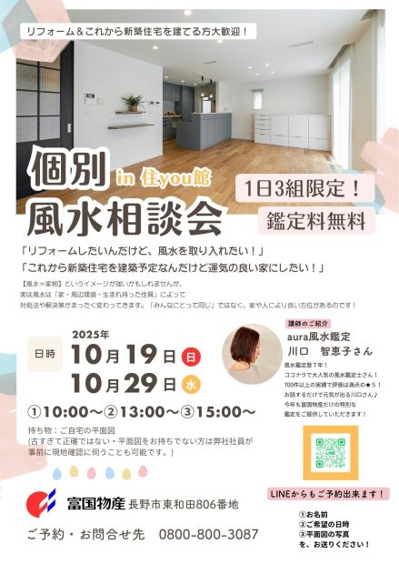 「これから新築住宅を建築予定なんだけど運気の良い家にしたい!」など、個別にご相談できるチャンスです★