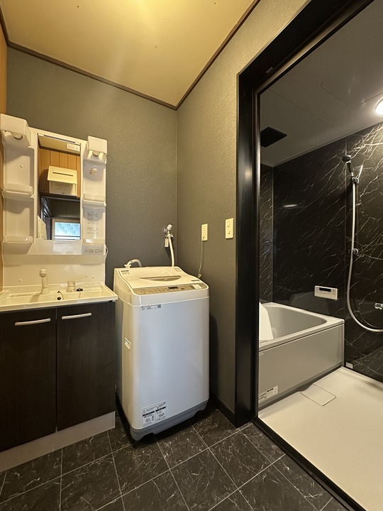 ホテルライクな洗面室に生まれ変わりました!❘長野市T様邸 こんにちは!富国物産リフォーム部です★ だんだんと寒くなってまいりましたね。。 体調に気を付けながら秋を楽しみましょう♪ 今回は洗面室のビフォーアフターをご紹介いたします! 今回はクロスや床の張り替え、洗面化粧台も新しいものに入れ替えました! ブラックを基調としたかっこいい洗面室になりました♪ 住宅資材の商社ですので、さまざまなメーカーの洗面化粧台を取り扱っております! 洗面化粧台の入れ替えのみのリフォームも大歓迎です(^▽^)/ 洗面室リフォームは富国物産にお任せください! AFTER リフォーム後の写真です。 浴室もブラックで統一しているので、かっこいいですね! ホテルのような非日常な空間です(^^)/ BEFORE リフォーム前の写真です。